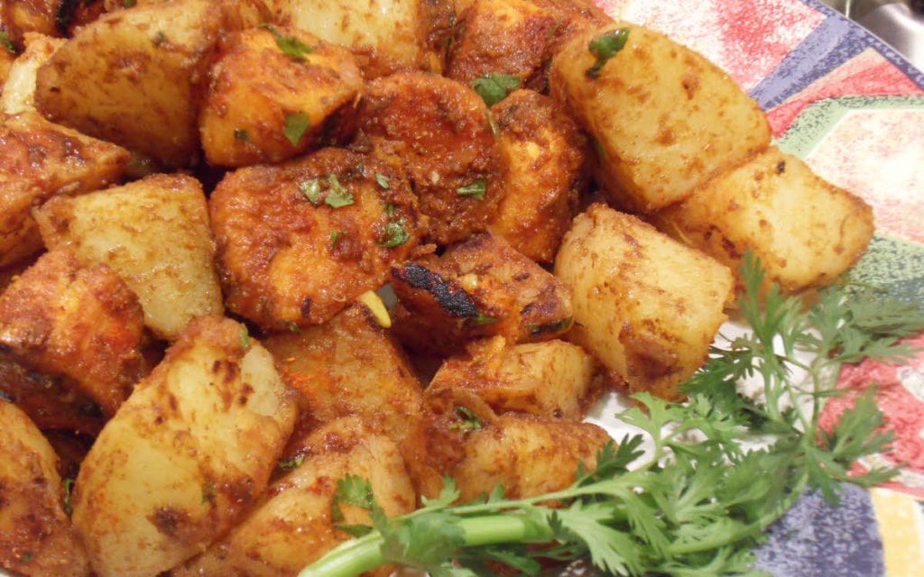 आंच से उतारकर उसमें करारे तले हुए आलू डालकर मिला दें.