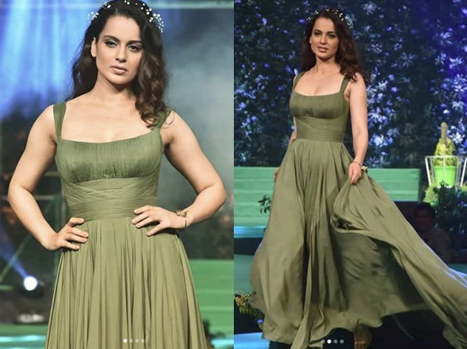 फैशन शो की शो स्टॉपर बनीं कंगना ने रैंप वॉक के दौरान ऑलिव ग्रीन कलर का बेहद खूबसूरत फ्लोई लुक वाला गाउन पहन रखा था। साथ में खुले बालों के साथ सिर पर फ्लोरल टियारा, न्यूड कलर की सैंडल और न्यूड मेकअप लुक में कंगना, इस बार ‘क्वीन’ नहीं बल्कि किसी प्रिंसेस जैसी दिख रहीं थीं।