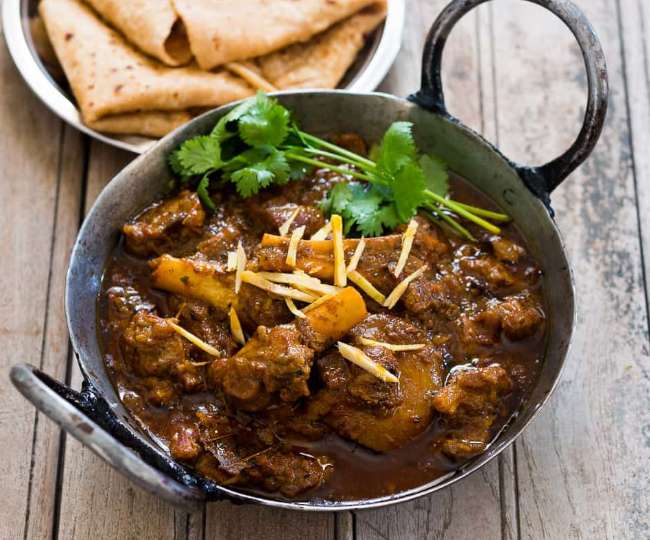 अब इसमें उबला हुआ मटन, सभी मसालों का पेस्ट, टमाटर, नमक और तीन कप पानी डालकर ढककर धीमी आंच पर 15 मिनट तक पकने दें।