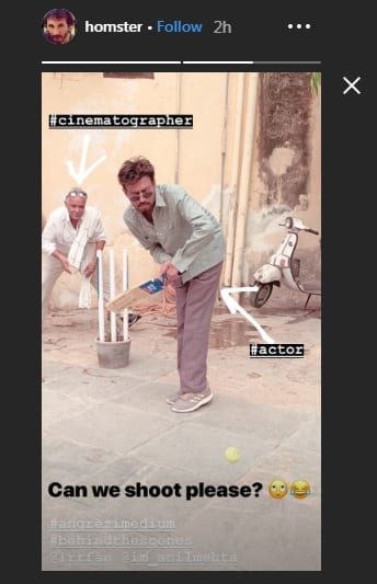 इरफान खान(Irrfan khan) इन दिनों अपनी आने वाली अंग्रेजी मीडियम(Angrezi Medium) की उदयपुर में शूटिंग कर रहे हैं। यह फिल्म हिंदी मीडियम का सीक्वल है। इस बार फिल्म में कुछ नए किरदार नजर आने वाले हैं। फिल्म को होमी अदाजानिया डायरेक्ट कर रहे हैं। फिल्म के सेट की कई फोटोज सोशल मीडिया पर वायरल होती रहती हैं। अब एक नई फोटो सोशल मीडिया पर वायरल हो रही है। इस फोटो में इरफान खान क्रिकेट खेलते नजर आ रहे हैं।
