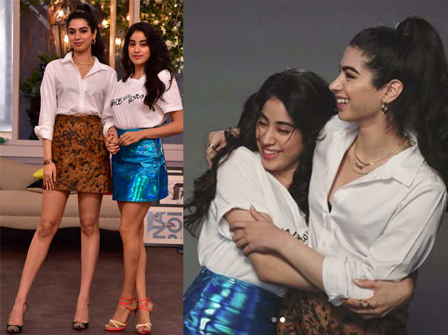 हाल ही में एक चैट शो के दौरान जाह्नवी और खुशी नजर आईं कलर कोऑर्डिनेट लुक में। जी हां, जाह्नवी और खुशी दोनों ने ही वाइट कलर का टॉप और मिनी स्कर्ट पहन रखी थी। जाह्नवी ने जहां वाइट टी-शर्ट और ब्लू लेदर स्कर्ट पहनी थी वहीं, खुशी ने वाइट फुल स्लीव्स फॉर्मल शर्ट के साथ ऐनिमल प्रिंट स्कर्ट को टीम अप किया था। इसमें कोई शक नहीं कि दोनों बहनें बेहद खूबसूरत लग रहीं थीं।