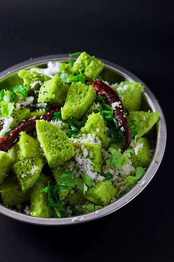 ढोकले को चौकोर टुकड़ों में काटें और ऊपर से हरा धनिया और कद्दूकस किया हरा नारियल डालकर सर्व करें.