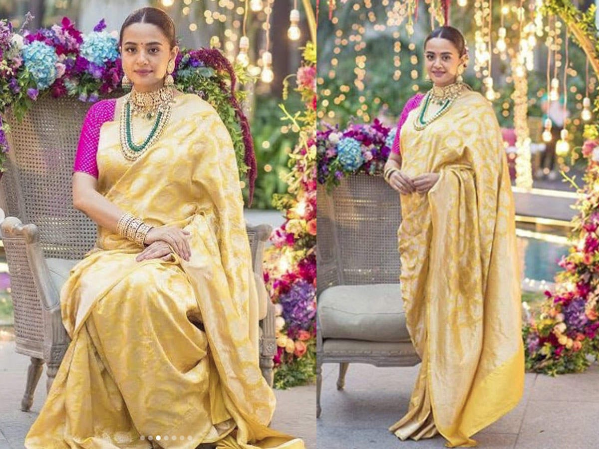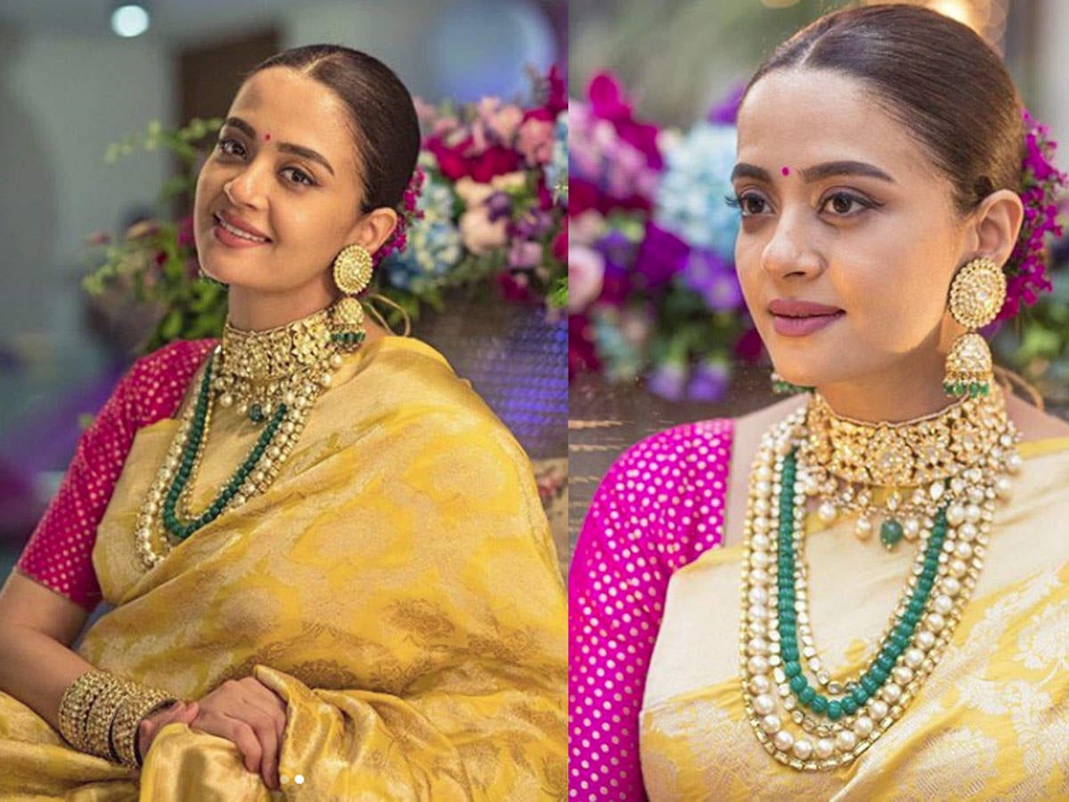 ट्रडिशनल लुक की बात करें तो इसमें बिलकुल किसी महारानी की तरह एक दम रॉयल लग रहीं थीं सुरवीन चावला। उन्होंने येलो कलर की हेवी बनारसी साड़ी पहन रखी थी जिसे उन्होंने रानी पिंक कलर की ब्लाउज के साथ टीम-अप कर रखा था और साथ में बालों में जूड़ा बनाकर रानी पिंक कलर के ही फूल भी लगा रखे थे।