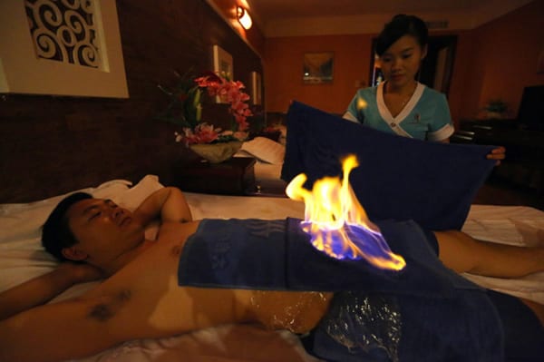 बीजिंग के एक छोटे से अपार्टमेंट में झांग फेंगाओं इस अनोखे तरीके को अपनाते हैं और लोगों का इलाज करते हैं… रिपोर्ट के मुताबिक, मरीज की पीठ पर पहले तो जड़ी-बूटियों का लेप लगाया जाता है और फिर उस पर एक तौलिया डाला जाता है.. इसके बाद पानी और अल्कोहल डालकर मरीज के शरीर पर आग लगा दी जाती है…